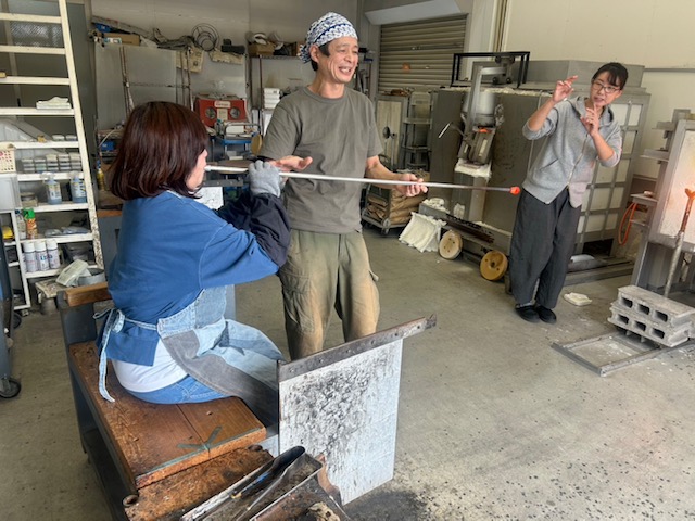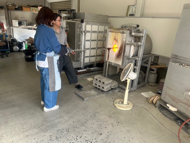高温で溶けたガラスに息を吹き込みながら吹き竿を両手でまわし、少しずつ形が変わっていくというとても繊細な作業でした。