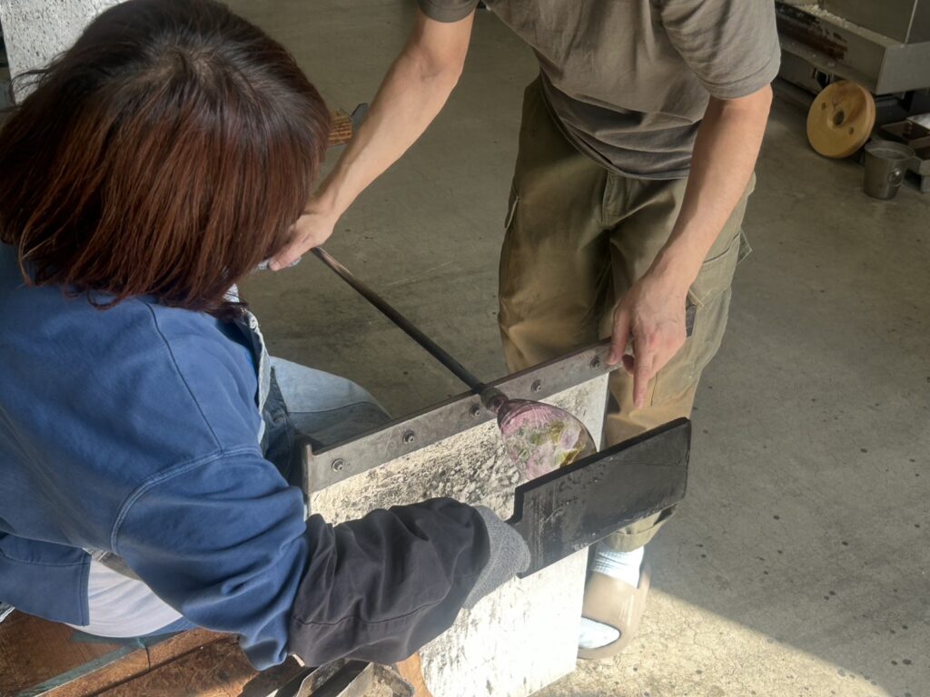 初めて触れるガラスの熱と重さにドキドキしながらも、職人さんに教わりつつ、