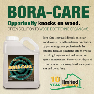 ボラケアは木材の保護を目的に開発された商品で、木材に浸透し、長期にわたり防蟻・防虫・防腐効果があります。ボラケアで施工した新築物件がシロアリの被害にあった場合、10年間補修費用が保証されます(最大500万円)。