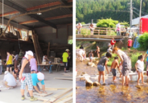 約25年間、木工教室を通じ地域の皆様と交流をしております。毎年30~40人の子供達が参加して、親御さんも童心に戻り楽しまれています。大工による木工教室の後は、イワナの掴み取りを行うなど思い出づくりに貢献できるイベントとして皆でワイワイやっています。